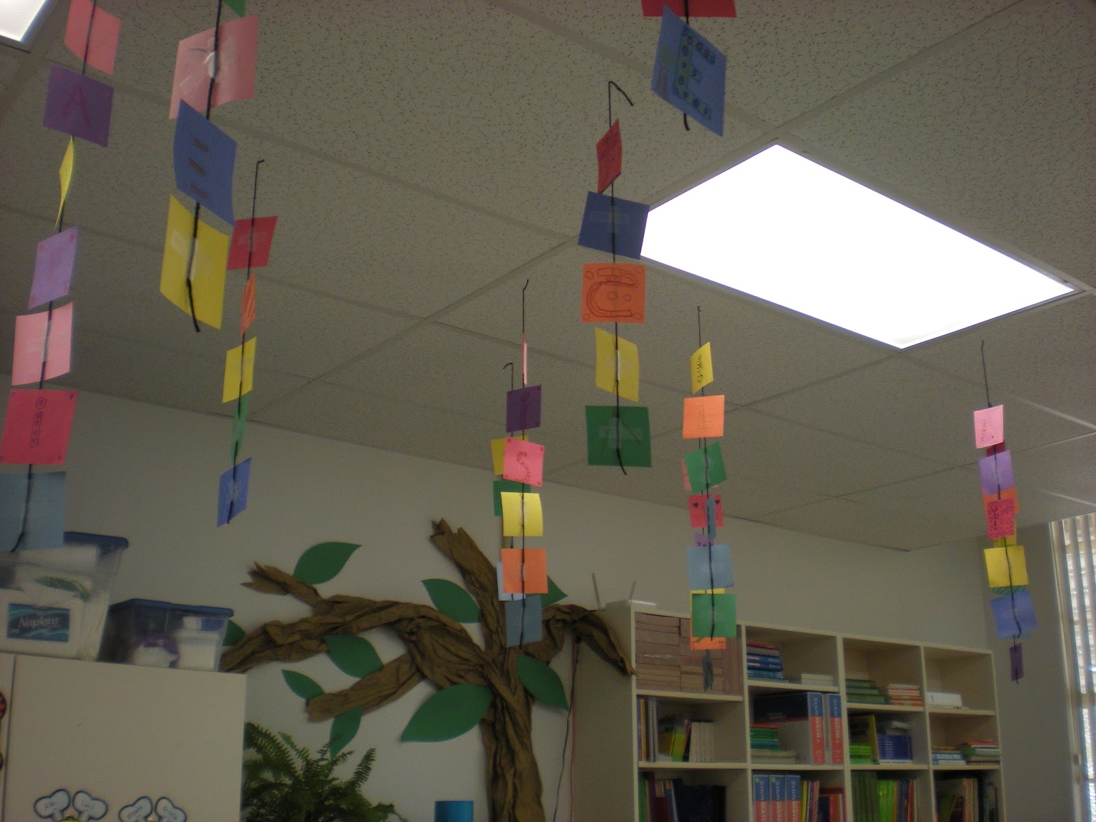 I hung the names from the ceiling and ta-da! Super colorful and cute addition to our classroom. If I do this activity again next year, I may have the students create two of each letter so they are double sided and can be seen when the yard twists.